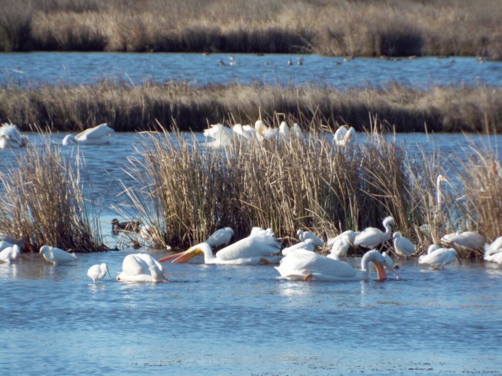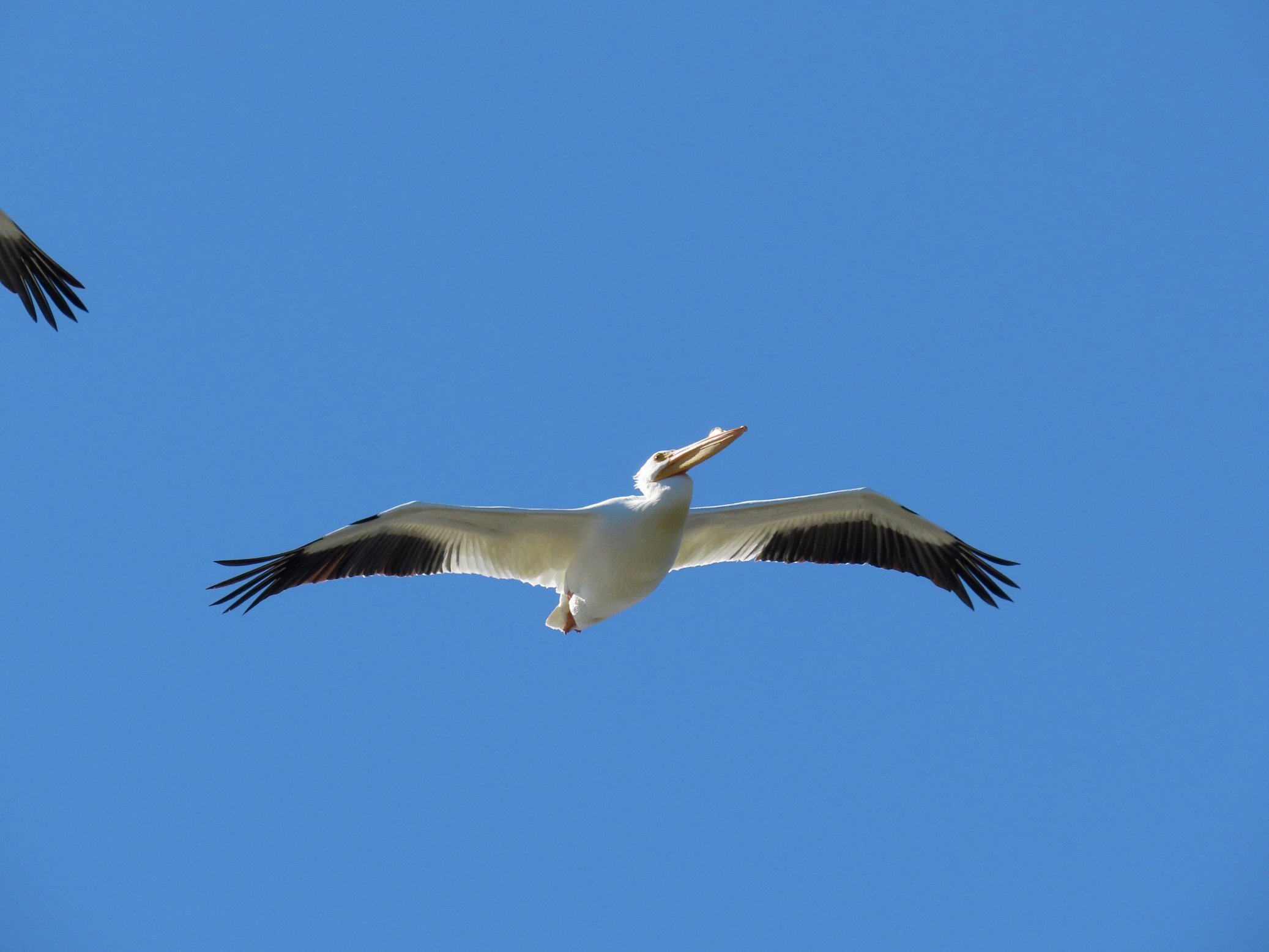 Despite having the same body plan and expanding throat pouch as our local Brown Pelican, the White Pelican acts like a different beast altogether. Rather than plunge diving like a dip-net to take a scoop from the middle of an unsuspecting school of fish, the White Pelican instead makes mealtime a group exercise. White Pelicans will paddle shoulder-to-shoulder together in shallow waters with their beaks extended forwards. As they putter along they corral fish together into an ever-growing school, like a seine net dragged between two fishermen. Once the team of Pelicans hit a limit they encircle they fish and scoop them up in a feeding frenzy. Then they turn around and make another pass. Sometimes you can find flocks of White Pelicans over a hundred birds strong on especially productive waterfowl impoundments. But most often, they’re seen soaring past overhead in flocks of about a dozen or twirling about on a small impoundment in groups of two to twenty.