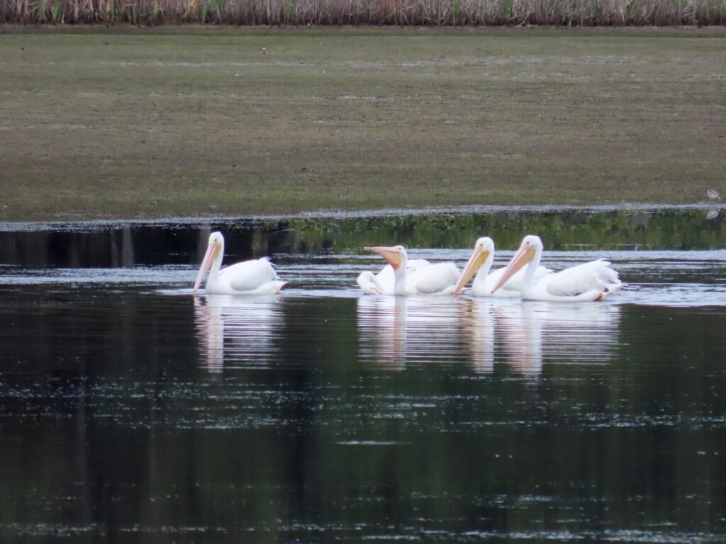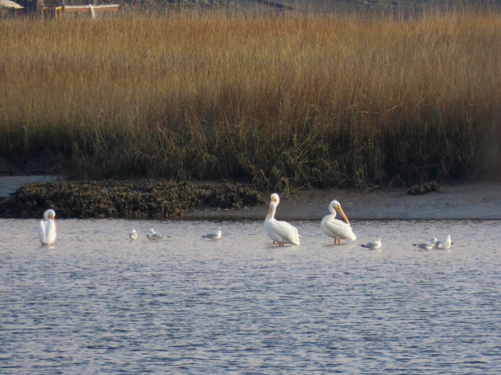American White Pelicans are found around the Sea Islands primarily in winter and disappear in the warmer months to return to their breeding grounds in the West. They’re a relatively new addition to the Lowcountry’s retinue of avifauna, having spread northward from their wintering grounds in Florida over the last few decades to take advantage of the bountiful provisions of the ACE Basin’s well-kept duck fields. We’re at the northeastern extreme of their wintering grounds here in the South Carolina coastal plain and the species is far more abundant along the Gulf Coast. They’re also becoming more abundant in beach side lagoons, shallow estuaries, golf courses, unmanaged stormwater impoundments, and even the hydroelectric lakes further inland.