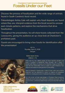 Throughout the presentation, he will share fossils collected from the Lowcountry, giving the audience an up-close look at Charleston’s prehistoric past.