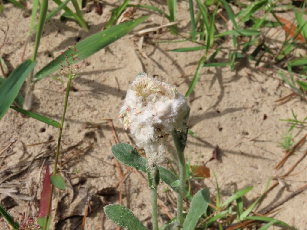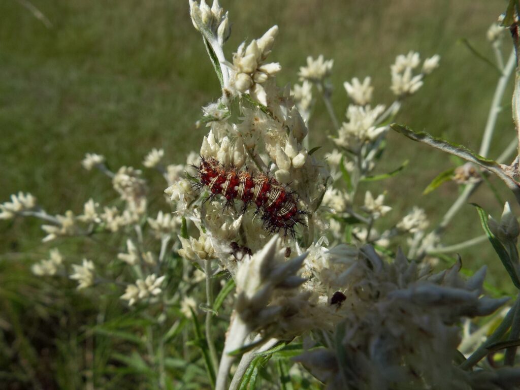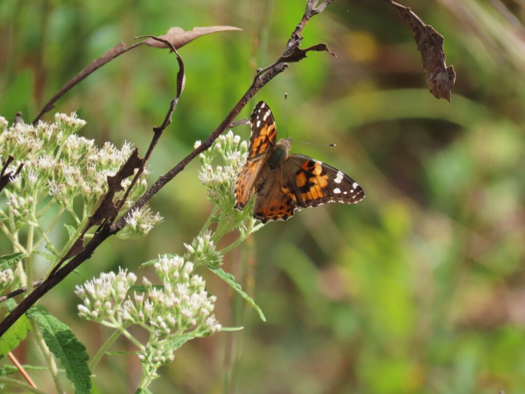 To be more specific, the American Lady is the more widespread and abundant of the two here in the Lowcountry. They begin to fly at the doorstep of spring and can be encountered all the way into December. Their caterpillars host on a handful of low-growing annual wildflowers, most often Rabbit Tobacco (Pseudognaphalium obtusifolium) but also Cudweeds (Gamochaeta spp.) and Annual Trampweed (Facelis retusa). Their caterpillars are strikingly colored with alternating bands of bone-white pinstripes or a calico of black, white, and cinnabar-red and with each of those red blotches bearing a black jagged thorny spine. Their caterpillars have a unique way of feeding too. They’ll bend the tip of a flower stalk or twig from their host plant over and tie it back onto itself before encapsulating the arch in silk, to form an upside-down sleeping bag for themselves. The caterpillar will hide inside for protection and emerges only to feed on foliage and flower buds, often in the morning. Adult butterflies of both species look very similar but can be told apart with either wings closed or spread. With wings open the differences are subtle. On the American Lady, look for a small white dot in the center of the top orange cell on the edge of the forewing. With wings open, that same spot may also be visible but look instead to the hindwing where you’ll find two large eyespots and an obvious jagged white band across the whole hindwing.
