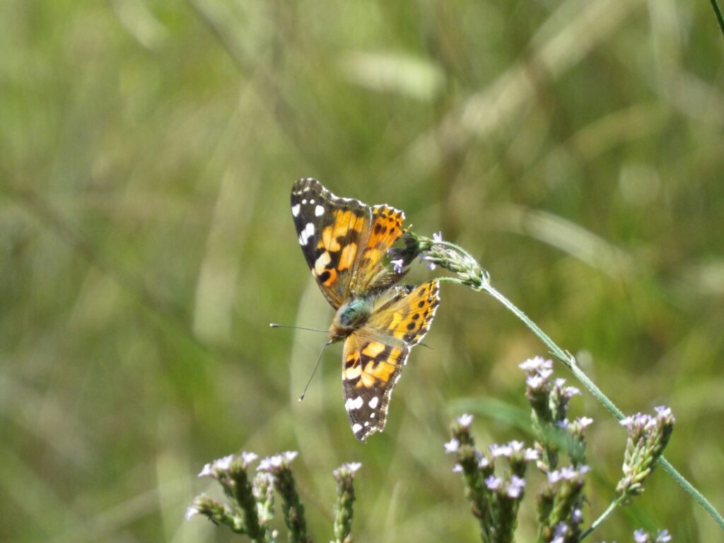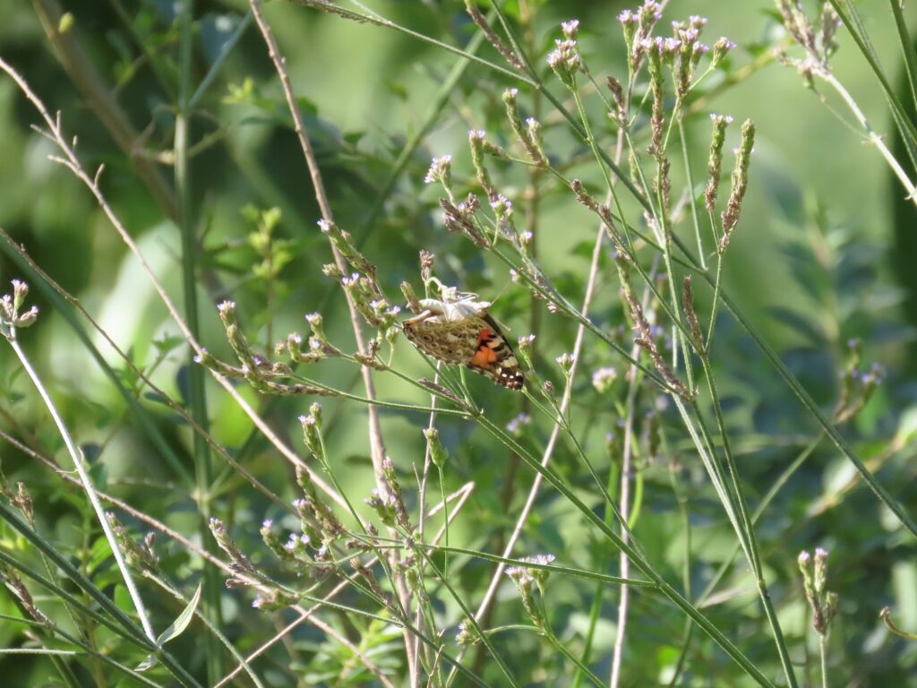 The Painted Lady is a cosmopolitan species, being found across Europe, Asia, Africa, and North America. They are not frost hardy. So their core populations are found only in the tropics. To compensate for this limitation, they are a tropical migrant. Tropical migrants are butterfly species that overwinter in the tropics but migrate north into temperate regions in the spring and summer to take advantage of a much larger territory, before retreating towards the equator in fall. This is an arduous but not uncommon strategy employed by many of our “local” butterflies and takes multiple generations to complete the circuit in a year. As a tropical migrant with a regional core population in Mexico and the Caribbean, the Painted Lady is more sporadic in its abundance. It is most often encountered in South Carolina from August through October, as its abundance swells across the United States in summer and northeastern butterflies fly south to escape the winter. This species has a propensity for getting a wild hair of wanderlust too. Painted Ladies will be swept up in the trade winds of the Atlantic and have been flung to nearly every remote island in the Atlantic Ocean at some point, and some with great regularity. This is almost assuredly how their North American population was established. The Painted Lady’s caterpillar hosts on Thistles (Cirsium spp.) most often and they also form a silken sleeping tent from their host’s foliage up above the ground. Their caterpillar is just a spiny as their American sister but is more variable in their coloration. Sometimes they’re mainly black with yellow and orange accents, sometimes they’re a frosty-gray with orange bands, and other times they’re a custom palette somewhere in between. The adult Painted Lady butterfly lacks the white spot on the outer center of the forewing, which is seen in the American Lady. On the underside of the hindwing they have four eyespots on the outer edge, with the inner two being about half the size of the outer two, and their overall wing pattern is a uniform cobweb of white on brown with no obvious bands. Further, their overall coloration below tends to be a warmer brown and the color showing on their forewing tends to be closer to orange than pink.