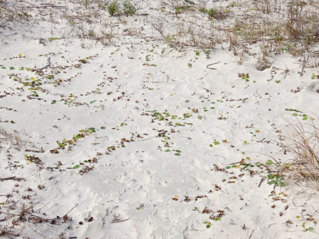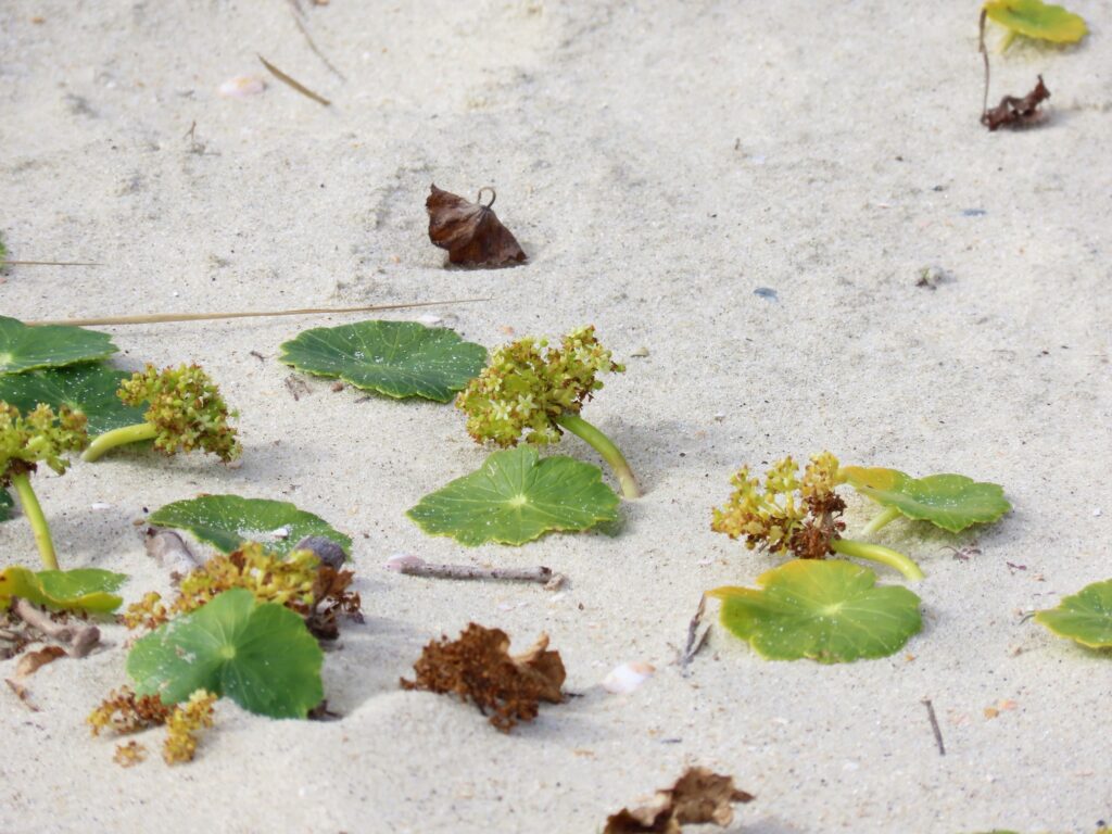 Lastly we have today’s subject, Largeleaf Pennywort, which is very similar in leaf appearance to Manyflower Marsh-Pennywort. Largeleaf Pennywort has consistently large, circular leaves and bears yellow-white flowers in relatively large umbrella-shaped clusters. But what sets it apart is where it grows, the beach. More specifically in the harsh environment of our barrier islands’ beach dune systems, adding it to the ranks of a select few plants that can tough it out at land’s end. Largeleaf Pennywort has some salt tolerance, allowing it to brush off a surge or king tide every now and again, but it’s no halophyte. It is best adapted to life in the back dunes but will run on the front beach when it must. The large, leathery, waxy, evergreen leaves of Largeleaf Pennywort allow it to tolerate the drying effects of continuous wind and salt spray while also mitigating the heat and radiation stress of continuous direct sunlight. Its underground stolon weaves it an expansive root system, allowing the plant to anchor itself in the ever shifting sands while finding and storing scant sources of fresh water. The long chains of leaves it shoots up through the sand also serve as a tiny sand fence, slowing air and trapping sand to help better stabilize the dune system. This makes Largeleaf Pennywort an important part in the beach dune system and one of the frontline plants that collectively help hold the beach together.