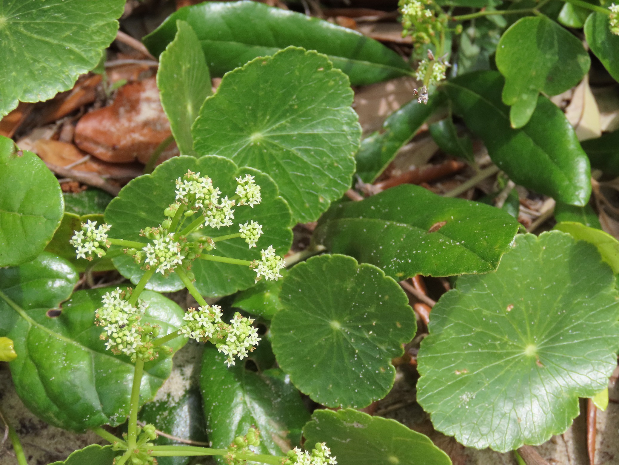 Largeleaf Pennywort is edible and can be eaten as a green, a pot herb, or made into a juice. However, some folks report a nauseating affect. So snack with caution. (And in general, never forage plants from a lawn you don’t manage yourself. You never know what someone may have sprayed on it nor how recently they did so.) There is also long ethnobotanical history between humans and Hydrocotyle species globally, and many purported health benefits from their consumption. Thus, there has been some scientific interest in the plant for pharmacological use and agricultural cultivation. Modern scientific studies indicate that the species appears to be safe to eat (excepting the potential for nausea), it is relatively nutrient dense, and contains a suite of phytochemicals that may prove to be beneficial to human health when taken as a dietary supplement. However, few, if any, efficacy trials have been published to date and so the plant’s potential health benefits are still purely speculative. But recent early research places Largeleaf Pennywort in a category as a candidate “superfood” and an ecologically sustainable crop for future human use.