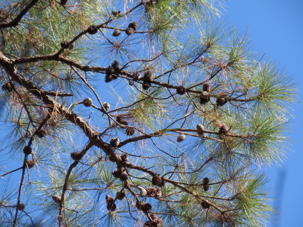 Pond Pine is found across the coastal plain of the South Atlantic, from the panhandle of Florida north to the bottom end of New Jersey, and here in South Carolina it resides below the fall line. Pond Pine is one of our more diffuse pines, growing mainly in scatter clusters around the landscape where habitat conditions are most suitable. Pond Pine strikes a keen resemblance to many of our other pine species, sharing ruddy brown and mottled flaky bark, hand-length deep-green needles, and a tall straight posture. It’s often a dead ringer for Loblolly Pine (Pinus taeda) and takes a sharp eye to pick it out of the canopy. But thankfully, Pond Pine has a few traits that help differentiate between these two native pines. The most distinguishing characteristic of Pond Pine is its cones. Unlike our other Lowcountry pines species, Pond Pine’s cones are nearly spherical and about two-and-a-half inches across, a width somewhere between a golf ball and a tennis ball. These cones usually stay tightly closed for a season and cling to the tree for multiple years, making them a dead giveaway you’re looking at a Pond Pine. The crown of Pond Pine is usually quite messy to boot, with numerous short stods from old dead branches erupting out of the trunk and trailing below the live limbs, and often a bent, warped, or twisted character to its upper trunk and major limbs. Further, Pond Pine is one of the few pine species that can regenerate from its trunk. So, you’ll occasionally spot individuals with needles or twigs growing directly out of bark fissures on the lower half of the trunk. Lastly, Pond Pine needles, when shed, are noticeably a paler shade of orange, an almost sickly looking jaundiced-yellow, compared to shed Loblolly Pine or Slash Pine (Pinus elliottii) needles, at least in my own experience around Edisto Island. This difference in duff color is a rather subtle distinction but in mid-winter, when pines shed their oldest needles, it can appear like a circle of chartreuse highlighter around the base of a lone Pond Pine poking through a canopy of Loblolly Pines.