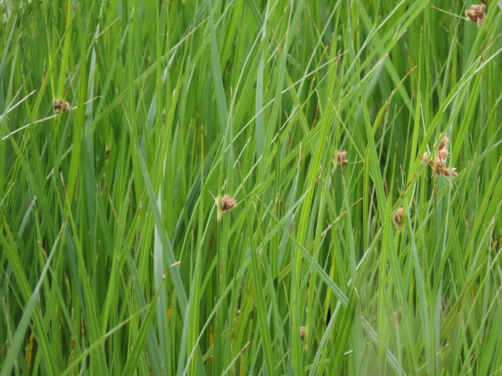 Saltmarsh Bulrush, also called Seacoast Clubrush, is a species of sedge found up and down the Eastern Seaboard of the United States. It used to belong to the genus Schoenoplectus but was recently split off into Bolboschoenus and, between these two genera, there are about seven species of Bulrush found in South Carolina, three of those being fairly rare in our State and then two of those rare species being mainly inland and submergent in growth form. But here on the coast, Saltmarsh Bulrush is the most common species you’ll encounter in our salt suffused marshes around the Sea Islands. Saltmarsh Bulrush has more salt tolerance than other Bulrushes and grows abundantly in the brackish marshes of tidal rivers, especially in old tidal rice impoundments where it can be the dominant vegetation. It also occurs on brackish pond banks and on the upland borders of salt marshes, in the uncommon spots where there is consistent confluence of upland groundwater running out to sea and intermingling with tidewater to create micro-habitats of brackish marsh.