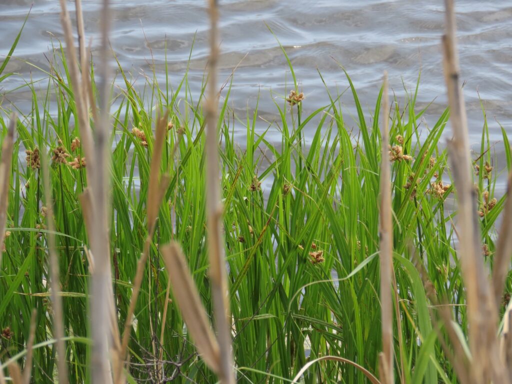 Saltmarsh Bulrush is a perennial aquatic sedge that spreads clonally through underground rhizomes. It has a grassy appearance and emerald-green leaves and stems reaching up to waist-high. As a sedge, not a grass, it has stems that are triangular in cross-section and leaves with a strong crease down the center. In ideal conditions, it grows vigorously and can form a monoculture in shallow brackish waters. Saltmarsh Bulrush flowers appear at the top of the stem from brown, hairy, teardrop-shaped structures in clusters of a dozen or two. It begins to bloom in early spring and can continue blooming throughout summer. Its seeds mature within these same structures before being shed into the water below, where they drift to shore or settle below into the sediment. These seeds provide food for waterfowl, rails, and rodents and the Bulrushes themselves provide cover and protection for these same critters, and many more.