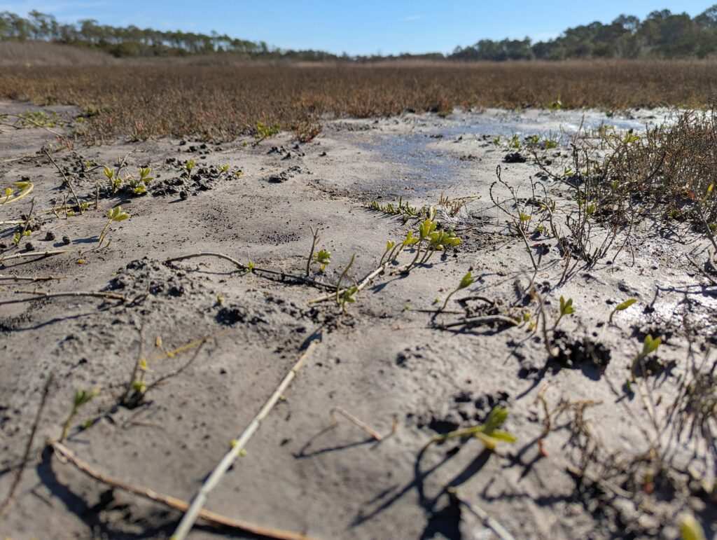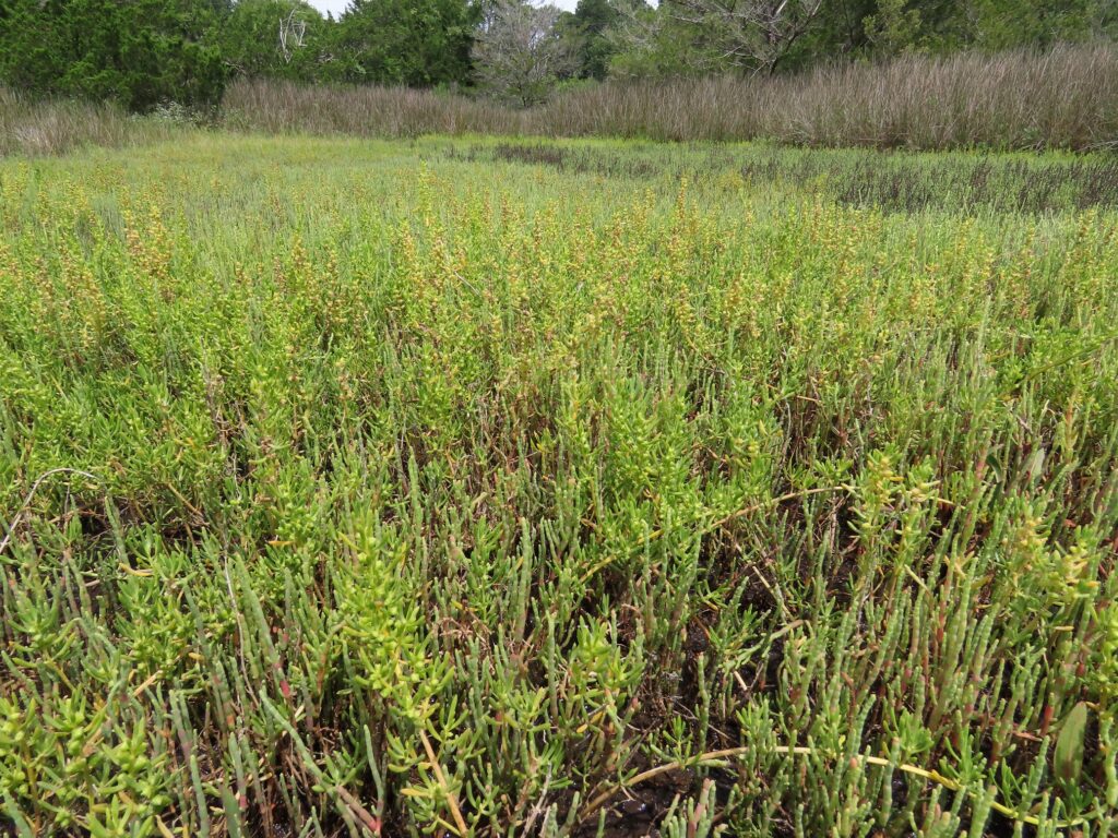 Saltwort can be sighted along the Gulf Coast of the United States and ranges naturally up the East Coast to just below the Santee River here in South Carolina. It’s mainly found behind our barrier islands, growing in the sand flats of their back marshes. Saltwort is a halophyte, a salt-lover, and grows in much the same habitat as our common Perennial Glasswort (Salicornia perennis). These two salty succulents often grow together, but Saltwort clings to the oceanfront much more tightly. This is because Saltwort thrives in a subtropical climate and in very high salinity. The sand flats of South Carolina’s barrier island back marshes check both those boxes. Their proximity to the Atlantic Ocean ensures both a regular supply of full strength seawater and a tempering tropical micro-climate throughout the winter.