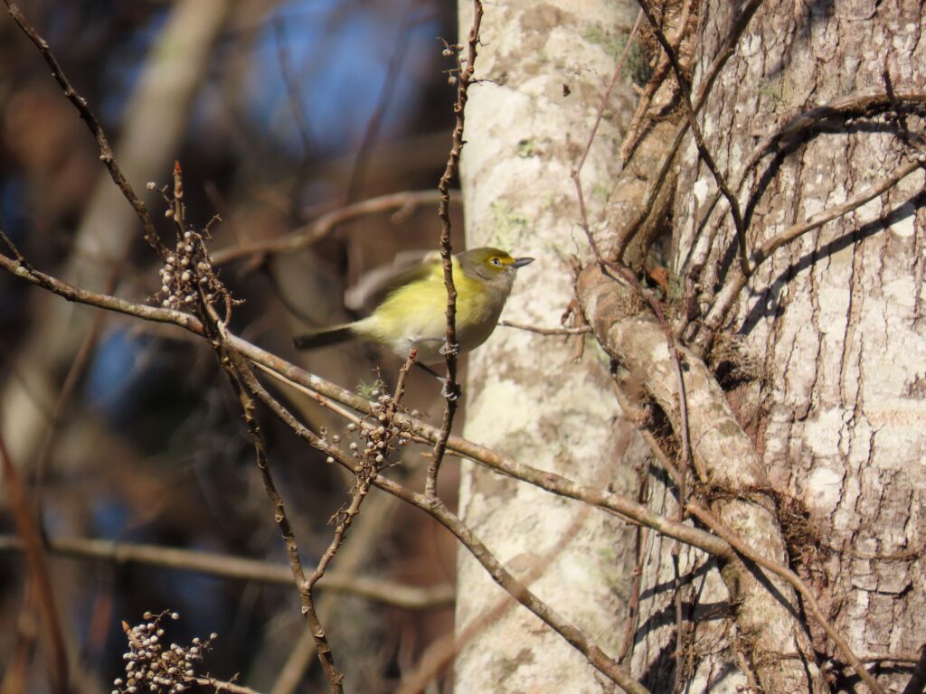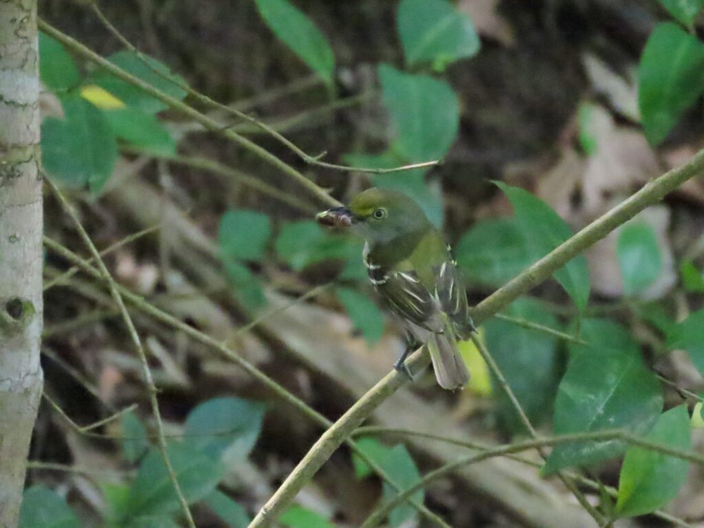 The White-eyed Vireo is a small songbird found throughout the southeast. Although many of them migrate to Central America for winter, a small sect of the species hangs out year-round in the coastal plain of the Deep South, including the South Carolina Lowcountry. White-eyed Vireos are specialized for life in heavy brush and thickets. You’ll find them commonly on forest edges, pond banks, hedgerows, pocosin rims, and in old clearcuts. They’re a common bird, and they’re commonly found anywhere there are dense shrubs. White-eyed Vireos, as well as most other Vireos, are insectivorous leaf gleaners. They get their daily bread by moving from branch to branch combing leaves and twigs for arthropods to eat. They’ll also scarf down small fruits, especially in winter when insects are scarce.