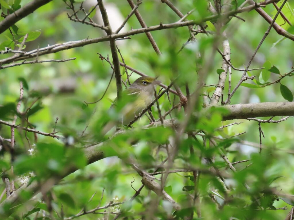 Vireos, in general, are small perching birds in the same size bracket as the warblers, and the White-eyed Vireo is no exception to that generality. They’re an easy bird to identify, if you can land your eyes on one through the brush. Dark tail feathers and wings with a wash of olive-green along the margin and two heavy white bars on the shoulder of each wing, a pale belly with a belt of yellow wash across the breast and down the flanks, a white throat, an olive-green mantle to the back, an aluminum-gray hood over the head, a blue-black faintly hooked bill, a lemon-yellow mask, and a namesake striking ice-white eye, all these traits come together to style a bird that’s an unmistakable sight across much of the Eastern United States. The White-eyed Vireo’s vocalizations are also quite unique, with calls a nasally resonant scolding “cluck” or “mew”. Their song is a phrase that is both hard to describe and hard to mistake, at least once you have an ear for it. The song is usually four to six notes that blend together like a sentence. It starts sharp and loud and then bounces up and down in volume, then either trails off in a mumble or ends in a decisive note as loud as the first. It kind of has an iambic pentameter character to it. There are many mnemonics out there to better remember the White-eyed Vireo’s calling card, but most birds haven’t read the field guides and are prone to going off script. So it’s best to learn it by ear and make your own memory of it, at least in my opinion.