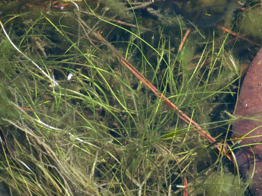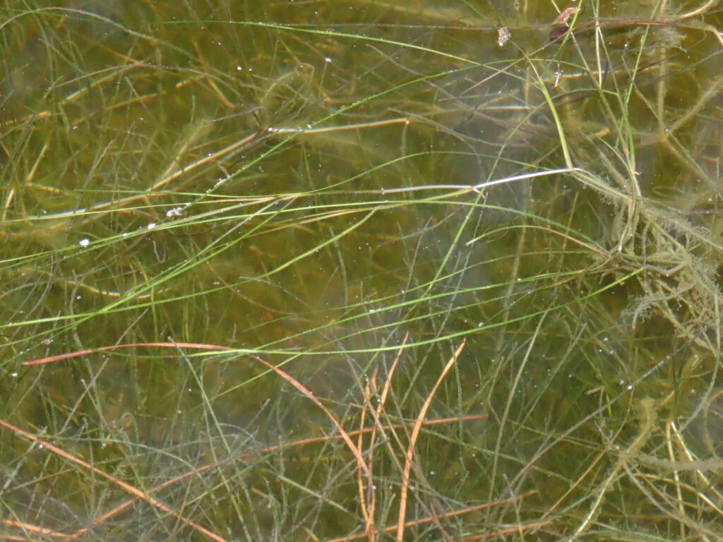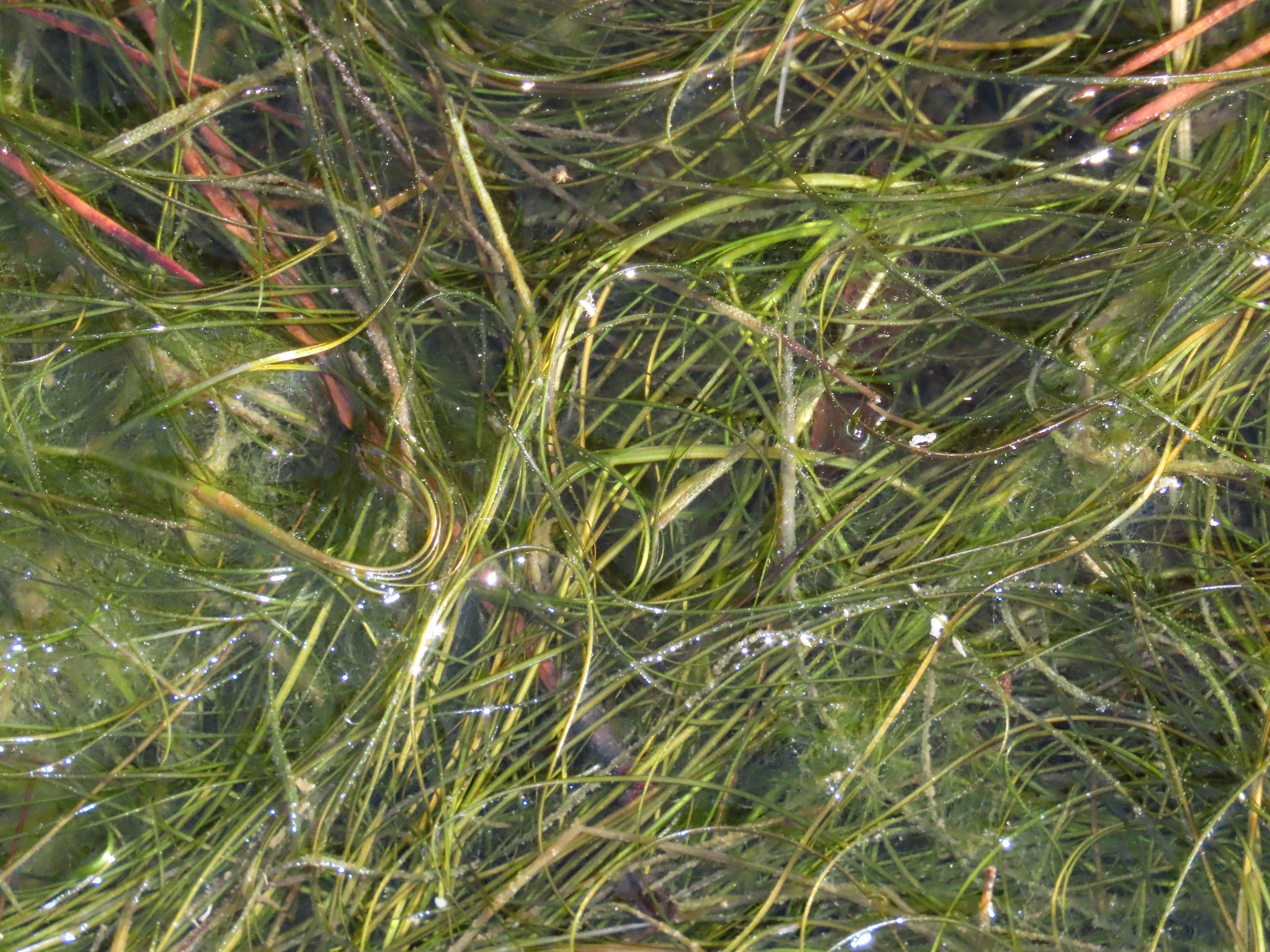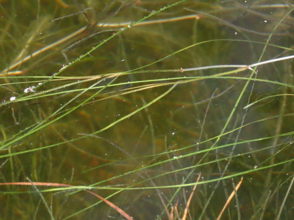 Widgeongrass is neither a grass, nor is it a widgeon. It’s a member of the monocots clade of plants and belongs to a small family, Ruppiaceae, containing just the one genus of Ruppia, with only eleven species contained within it. Widgeongrass is found in coastal waters all throughout the United States and much of the globe. It thrives in saline and brackish ponds, ditches, lakes, lagoons, and impoundments that hold water year-round. It a submergent aquatic plant, growing from the saturated soil of a wetland but staying entirely beneath the water’s surface. The plant grows in wiry, forking fans of zigzagging threads that hue a dark pine to emerald-green in color. The plant spreads through underground rhizomes and its many stems grow together to create a dense wall of stringy vegetation around the shores of brackish ponds or coalesce into heavy mats all throughout more shallow impoundments. These mats help stabilize shorelines, create underwater habitat, and the plant itself sequesters excess nutrients from the water column.