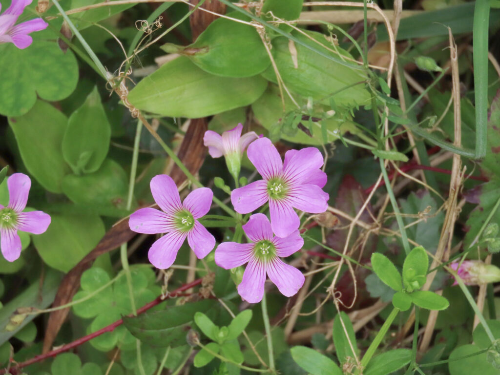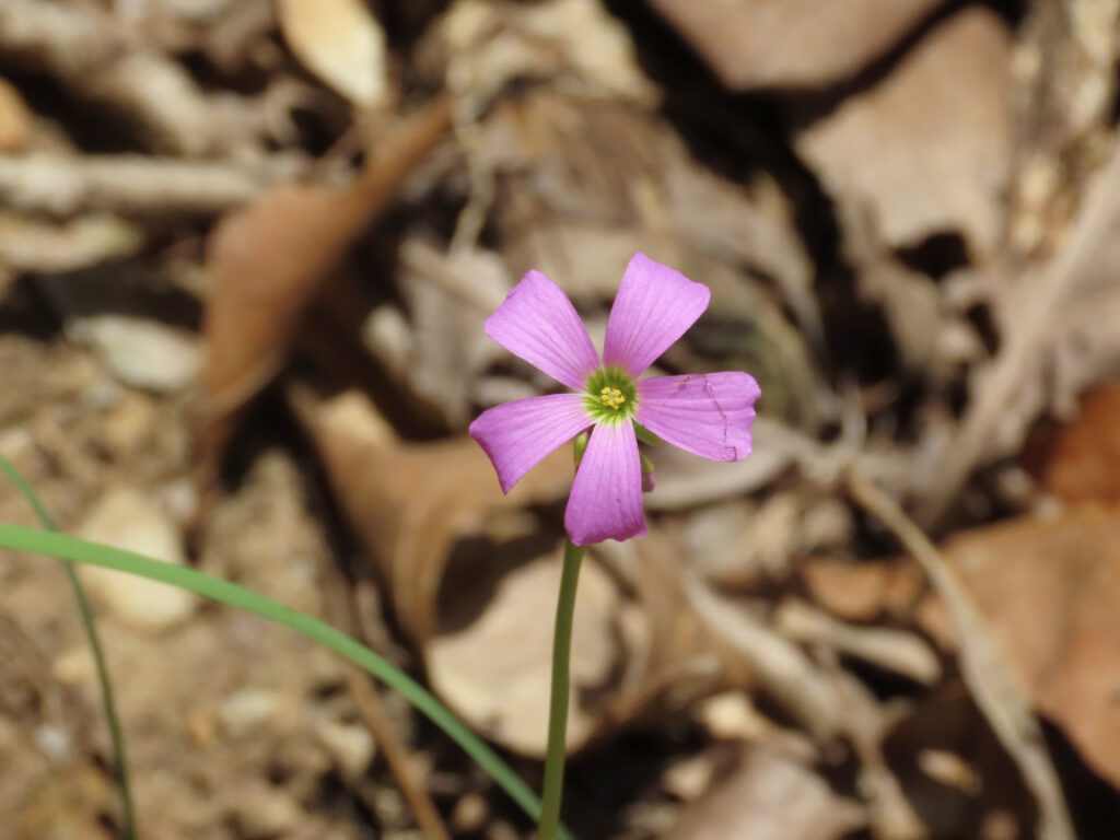 Pink Wood-Sorrel is an exotic species native to the subtropics of South America. It is a strong perennial with a woody, taproot-like rhizome that extends down several inches into the soil. Its leaves have fine hairs across their surface and these leaves can range widely in size from and an inch to two inches across. Its flowers are large and hot-pink with fine magenta lines and most often a burgundy center. Pink Wood-Sorrel is commonly sold as an ornamental and can sometimes be found around homes, gardens, and roadsides in the Lowcountry.